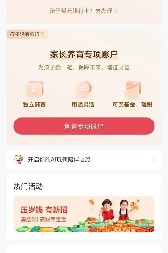 银行春节营销活动 - 多家银行在春节期间针对儿童和青少年群体推出“压岁钱”专属账户及储蓄计划等创新金融服务,并在存款利率上给予一定优惠 [2] - 招商银行在手机银行App的“热门活动”界面推出了“压岁钱”专属直达路径,包含多款亲子账户和专属存款服务 [3] 银行具体产品与服务 - 招商银行上线“金小葵”管家服务,提供亲子账户,包含“宝贝银行卡管理”和“家长教育专项账户”功能,帮助孩子管理银行卡并实现专款专用 [5] - 招商银行在1月至3月期间,金卡M1及以上客户在专属账户存款5万元有机会参与抽奖 [5] - 招商银行一年期存款年化利率为1.3%,两年期存款利率为1.4%,均较普通存款利率有一定提升 [5] - 招商银行“金小葵”管家服务中,“压岁钱”的规划方向包括儿童黄金产品、3年期利率存款产品以及教育金和婚嫁金等 [6] - 工商银行推出“宝贝专属”存款账户,广发银行推出“自由卡”,中信银行、民生银行推出类似亲子服务,韶关农商银行推出少儿专属卡并附赠礼品 [6] - 北京农商银行推出“阳光宝贝卡”专属储蓄产品,3年期定期存款利率为1.75% [6] - 吉林银行推出“小吉存”存款产品,1万元起存,3年期存款利率最高可达1.8%,针对1至16周岁儿童及青少年 [6] 行业服务模式转型 - 银行“压岁钱”揽储模式从单一的“储蓄吸储”向构建“账户+教育+陪伴”的全周期儿童金融服务体系转型,营销设计更贴合客户需求,以差异化服务增强客户黏性 [8] - 银行在营销中注重传播“培养孩子的金钱观与理财习惯”等观点,例如招商银行推出“金小葵财商课堂”服务 [8] - 广发银行的“自由卡”是针对儿童的借记卡,拥有独立账户,满足孩子独立账户及小额消费自主权,存款提升至1万元、10万元等额度后可领取相应权益 [8] 行业战略意义与发展前景 - 将金融产品嵌入儿童教育理念的方式,能够提升客户忠诚度,并为未来青少年理财、留学金融、保险规划等高价值服务奠定基础,带动更多业务可能 [9] - 这一趋势反映了中国家庭财富管理意识的前置化与代际传承需求的深化 [9] - 北京银行“小京卡”客户已突破200万户 [9] - 截至2025年8月1日,招商银行天津地区亲子客群已达13.5万,管理资产规模超200亿元 [9] - 银行高度重视儿童金融服务,将其作为零售业务发展的新赛道,原因在于儿童金融客群未来服务需求潜力大、增长空间广阔,且儿童群体背后关联家庭整体银行服务,有望带动家长及家庭侧的金融服务 [9] - 未来儿童金融服务将成为银行拓展细分客群的重要方向,建议关注客户储蓄、保险目的及未来资金用途期望以设计针对性产品,并切入合适场景及渠道,通过亲子活动、金融科普等形式引导儿童提升财商 [9]