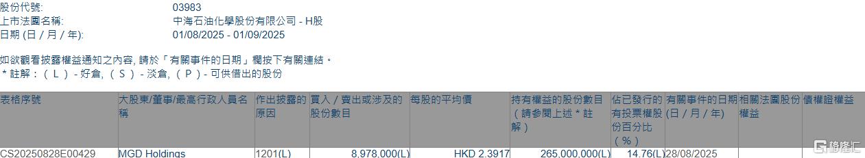 中海石油化学(03983.HK)遭MGD Holdings减持897.8万股