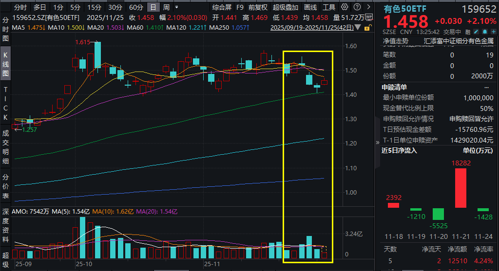 11月25日,美联储降息预期再升温,金铜集体上涨、强势反弹,有色板块回暖。截至13:26,有色50ETF(159652)放量涨超2%,有望终结三连 阴。 | 序号 | 什么样 | 名标 | 派跌幅 | 估算权重 ▼ | | --- | --- | --- | --- | --- | | 1 | 601899 | 三是非新 | 1.82% | 15.50% | | 2 | 600111 | 北方稀土 | 0.49% | 6.21% | | 3 | 603993 | 洛阳領収 | 3.84% | 5.84% | | ব | 601600 | 中国铝业 | 0.00% | 4.50% | | 5 | 603799 | 华友钻业 | 3.71% | 4.43% | | 6 | 002460 | 綜修伊小 | 1.96% | 3.65% | | 1 | 600489 | #### | 4.34% | 3.37% | | 8 | 600547 | 山东黄金 | 2.28% | 3.36% | | ਰੇ | 002466 | 天齐锂业 | 2.05% | 2.86% | | 10 | 6009888 | 赤峰黄金 | 2. ...