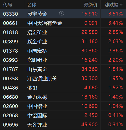 受美联储降息希望提振,港股有色金属股普涨,灵宝黄金涨3.5%,招金矿业、紫金矿业涨近3%,中国宏桥、洛阳钼业涨超2%