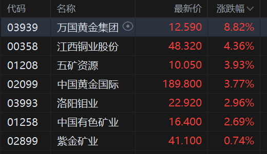 消息上,1月14日,铜价创下历史新高。市场担心特朗普政府扩大铜进口关税范围,贸易商赶在新关税 出台前加速向美国运铜,并可能导致世界其他地区面临供应短缺。渤海证券表示,资源争夺等市场情绪 对当前铜价影响较大,若短期情绪热度难以消散,铜价或维持高位震荡,关注后续相关事件走向。 | 代码 | 名称 | 最新价 | 涨跌幅 ▽ | | --- | --- | --- | --- | | 03939 | 万国黄金集团 ⊙ | 12.590 | 8.82% | | 00358 | 江西铜业股份 | 48.320 | 4.36% | | 01208 | 五矿资源 | 10.050 | 3.93% | | 02099 | 中国黄金国际 | 189.800 | 3.77% | | 03993 | 洛阳钼业 | 22.920 | 2.96% | | 01258 | 中国有色矿业 | 16.400 | 2.69% | | 02899 | 三十四年薪 | 41.100 | 0.74% | 港股铜矿股持续走高,万国黄金集团大涨近9%、江西铜业股份涨4.36%、中国黄金国际涨近4%、洛阳 钼业涨3%、紫金矿业涨近1%,这些个股均刷新上市 ...