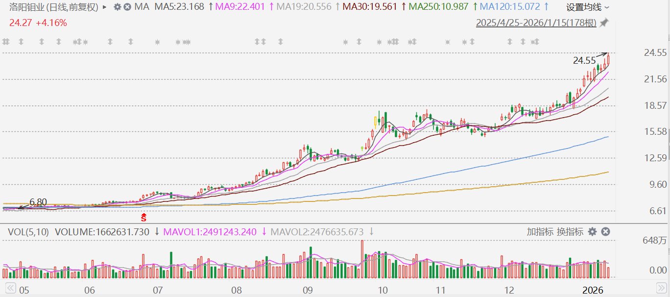 行业与市场表现 - 贵金属价格持续创新高,刺激A股有色金属板块走强 [1] - 洛阳钼业股价盘中涨超5%至24.55元,再创历史新高 [1] - 公司股价在2025年累计上涨210%后,2026年截至新闻发布日的9个交易日内再度累计上涨近22% [1] 公司资源与产能优势 - 公司掌握全球约23%的钴储量,并拥有世界级铜钴矿集群 [1] - 核心矿山的铜钴品位远超行业平均水平 [1] - KFM二期项目投产后,将再增加10万吨铜产能 [1] - 受益于刚果(金)的钴出口配额红利,形成量价共振以支撑业绩高增长 [1] 公司运营与成本控制 - 公司凭借资源禀赋优势和数字化改革降低成本,使铜生产成本处于相对低位 [1] - “矿山+贸易”的商业模式有助于平滑行业周期波动,抗风险能力行业领先 [1] 业务布局与长期发展 - 铜钴业务受益于新能源需求持续扩大 [1] - 巴西金矿并购完成以及厄瓜多尔金矿的布局,共同构建了“铜金双极”发展格局 [1] - H股股权激励计划有助于绑定核心团队,长期成长确定性高 [1]