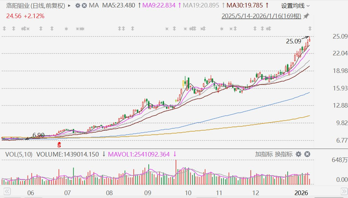 格隆汇1月16日|A股市场有色金属股继续走强,其中,入选了格隆汇2026年"下注中国"十大核心资产 名单的洛阳钼业(603993.SH)盘中涨超4%报25.09元,再创历史新高。该股在2025年累涨210%后,今年 在截至今日的10个交易日内再度累涨超25%。 洛阳钼业昨晚发布公告,预计2025年度实现归属于上市公司股东的净利润为200亿元到208亿元,同比增 加47.80%到53.71%。预计2025年度实现归属于上市公司股东的扣除非经常性损益的净利润为204亿元到 212亿元,同比增加55.50%到61.60%。公司2025年业绩同比大幅上升的原因系公司主要产品量价齐升、 运营成本有效管控。 ...