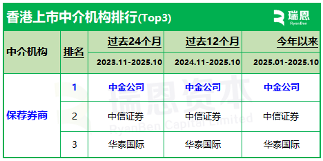智通财经APP获悉,瑞恩资本对香港中介机构统计数据显示,在过去的24个月(2023年11月至2025年10 月)香港新上市公司 173家;在过去的12个月(2024年11月至2025年10月)香港新上市公司 98家;在今年以 来(2025年1月至2025年10月)香港新上市公司 81家。根据统计,在过去的24个月,共有58间券商参与172 家新上市公司(不包括1家简易方式从GEM转主板)的保荐工作。 | 香港上市中介机构排行(Top3) | | | | >瑞恩 | | --- | --- | --- | --- | --- | | 中介机构 | 排名 | 过去24个月 | 过去12个月 | 今年以来 | | 2023.11-2025.10 | | | 2024.11-2025.10 | 2025.01-2025.10 | | 保存券商 | 1 | 中我公司 | 中金公司 | 中我公司 | | 中信证券 | 2 | | 中信证券 | 中信证券 | | 华泰国际 | 3 | | 华泰国际 | 华泰国际 | 上述15家券商中,中资券商10家,外资券商5家。 根据统计,在过去的24个月,共有58间券商,以上市保荐人、 ...