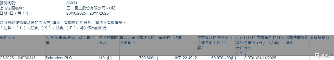三一重工(06031.HK)获Schroders PLC增持70.96万股