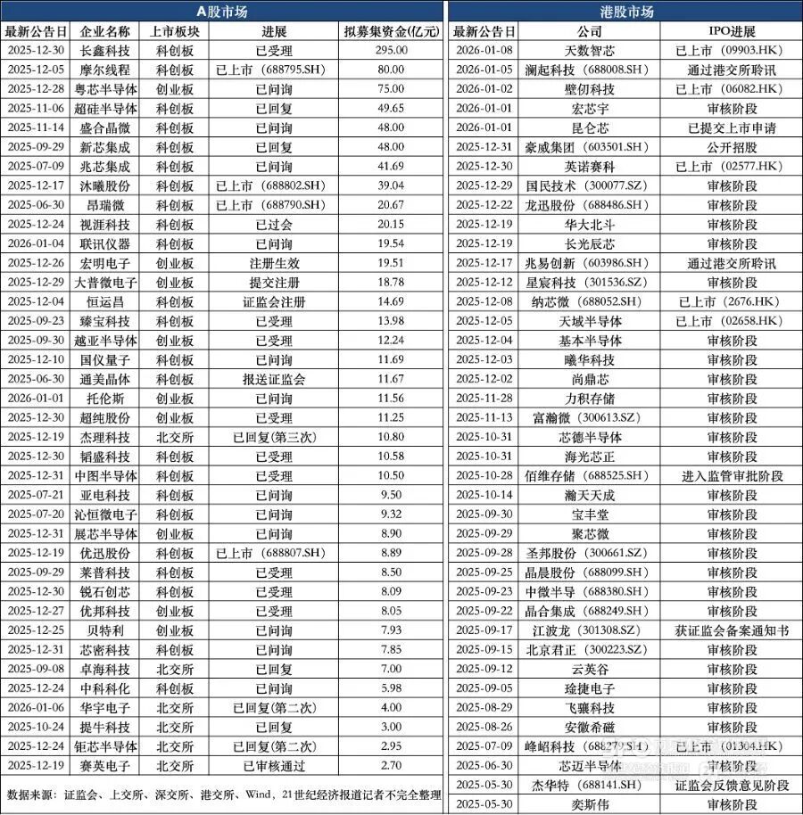 文章核心观点 - 中国半导体行业正经历前所未有的IPO热潮,大量企业正加速进入A股和港股市场,行业进入资本驱动与技术驱动并行的新阶段 [1][5] - 本轮IPO热潮呈现出A股与港股市场深度共振、募资规模巨大、资本精准聚焦于高算力、大存储及关键制造环节的特征 [5][6][13] - 热潮背后是自主创新持续推进、政策与市场红利叠加,以及AI算力需求爆发和供应链自主可控的迫切需求,资本市场正为国产芯片产业的关键发展提供燃料 [5][15][19] IPO整体规模与市场分布 - 截至统计日,共有95家半导体产业链企业开启或加速IPO进程,包括已上市10家,准备上市85家 [4] - A股市场共有55家,其中已上市4家,17家进入辅导备案,34家加速IPO进程;港股市场共有40家,其中已上市6家,34家冲刺上市 [4] - 2025年以来,有38家半导体企业开启A股IPO进程,合计拟募资金额近千亿,达996.65亿元,平均单家募资额达26.23亿元 [6] - 港股市场方面,2025年至今已有40家半导体公司启动赴港IPO计划,业务覆盖GPU、功率半导体、传感器、封测、设备等关键领域 [9] A股IPO募资与进展详情 - 2025年12月以来,A股半导体企业上市受理节奏爆发,近乎每天都有新进展 [6] - 部分企业已完成上市,包括昂瑞微、优迅股份、沐曦股份、摩尔线程 [6] - 募资结构呈现分化:长鑫科技、摩尔线程、粤芯半导体募资金额位列前茅,分别为295亿元、80亿元、75亿元 [6] - 超硅半导体、盛合晶微、新芯集成、兆芯集成、沐曦股份在资本密集型环节募资也超过39亿元 [6] - 大部分企业募资金额在10亿元左右,涵盖射频前端芯片、电子元器件、导电材料、半导体设备零部件、模拟芯片等领域 [7] - 表格数据显示了从长鑫科技(拟募资295亿元)到矩芯半导体(拟募资2.95亿元)等多家A股IPO企业的具体进展与募资额 [8] 港股IPO进展与“A+H”趋势 - 港股已成功上市的企业包括专注于高性能计算和GPU的壁仞科技、天数智芯,以及英诺赛科、纳芯微、天域半导体、峰岹科技等 [9] - 多家已上市A股半导体公司正在冲刺“A+H”二次上市,包括澜起科技、豪威集团、国民技术、龙迅股份、兆易创新、星宸科技、富瀚微、佰维存储、圣邦股份、晶晨股份、中微半导、晶合集成、江波龙、北京君正、杰华特等十余家知名企业 [10] - 港股IPO企业业务聚焦成长潜力高、研发投入大、产业链全覆盖的特征,抢抓智能影像、汽车电子、物联网等下游场景需求 [9] 产业链环节IPO分布特征 - **上游材料与设备**:材料环节主要集中在第三代半导体材料及高端衬底、封装材料;设备及零部件企业数量极多,反映了制造端自主创新带动上游供应链资本化 [13][14] - **中游IC设计(资本焦点)**: - **AI芯片/GPU/CPU/DPU**:成为资本估值重心,市场关注度极高,代表公司包括摩尔线程、沐曦股份、壁仞科技、天数智芯、燧原科技、昆仑芯等 [13][14] - **存储芯片**:成为产值重心,明星公司募资最多,代表公司长鑫科技拟募资295亿元创纪录,其他包括兆易创新、澜起科技、江波龙、佰维存储等 [13][14] - **模拟/功率/射频/MCU**:细分赛道冠军密集,特别是车规级功率半导体和高性能模拟芯片 [13][14] - **传感器/显示驱动**:图像传感器和新型显示驱动芯片是布局重点 [13][14] - **中游晶圆制造/代工**:企业数量少但单体筹资极高,如粤芯半导体(75亿元)、新芯集成(48亿元) [13][14] - **下游封装测试**:重点正从传统封测转向Chiplet等先进封装技术 [13][14] AI芯片/GPU领域市场热度 - 市场认购热情极高:摩尔线程、沐曦股份科创板上市网上发行初步有效申购倍数分别高达4126倍、4498倍;壁仞科技、天数智芯港股公开发售分别获得2347.53倍和414.24倍超额认购 [15] - 智能算力需求爆发式增长:中国信通院数据显示,2025年中国智能算力需求将达486 EFLOPS,是2023年的10倍以上 [15] - 企业商业化进展迅速:壁仞科技已在中国电信落地千卡集群并实现商业化异构混训;沐曦股份在手订单14.3亿元;摩尔线程与多家大型数据中心签约;天数智芯成为国内首家实现7nm GPGPU量产的企业 [15] - 二级市场反应热烈:摩尔线程科创板上市首日股价最高涨超500%;沐曦股份刷新近十年A股新股上市首日单签盈利纪录;壁仞科技港股上市首日最高涨120% [16] 存储芯片领域IPO驱动因素 - 行业正迎来由AI驱动的上行周期,企业有强烈的技术与产能扩张需求 [17] - **长鑫科技**:申报科创板IPO拟募资295亿元,主要用于存储器晶圆制造量产线技术升级、DRAM技术升级及前瞻技术研发项目 [17] - **融资需求迫切**:佰维存储从2022年至2025年上半年,仅在2024年实现5.3亿元经营现金流净流入,其他时间均为净流出,凸显融资需求 [17] - **多元化上市目的**:澜起科技赴港IPO募资将用于互连类芯片前沿技术研发;兆易创新(截至三季度末货币现金100.1亿元)赴港上市旨在推进新加坡国际总部建设并扩大全球销售网络 [18] 晶圆制造与行业深层意义 - 晶圆制造环节企业IPO数量少但单体募资额高,如粤芯半导体募资75亿元用于12英寸模拟特色工艺生产线三期等项目 [18][19] - 半导体企业密集冲刺IPO,表明资本市场对国产芯片赛道的持续关注,企业需借助资本市场实现资本驱动与技术驱动的双轮并行,以应对全球竞争 [19] - 这场资本盛宴背后,是对中国半导体未来发展的集体押注,特别是在AI算力需求爆发、外部供应链不确定性增加的背景下,资本市场正在为国产芯片的压力测试提供关键燃料 [19] - 半导体企业的集体IPO,可能预