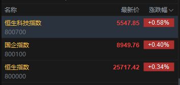 大型科技股中,阿里巴巴-W涨0.28%,腾讯控股涨0.25%,京东集团-SW涨0.63%,小米集团-W涨 0.25%,网易-S涨2.52%,美团-W平收,快手-W跌0.16%,哔哩哔哩-W涨1.4%。造车新势力普涨,理想 汽车、零跑汽车涨超1%;新股壁仞科技开盘大涨82%,市值达855亿港元。 离岸人民币兑美元升破6.97,最高升至6.9678,创2023年5月以来新高。美股在2025年最后一个交易日走 势向下,科技股走势拖低大市,三大指数均录得跌幅收市。美元低位靠稳,美国十年期债息回升至4.17 厘水平,金价急跌后有反弹,油价则有所回落。 1月2日,港股恒生指数开盘涨0.34%,报25717.42点,恒生科技指数涨0.58%,报5547.85点,国企指数 涨0.4%,报8949.76点,红筹指数涨0.56%,报4037.86点。 | 名称 | 最新价 | 涨跌幅√ | | --- | --- | --- | | 恒生科技指数 | 5547.85 | +0.58% | | 800700 | | | | 国企指数 | 8949.76 | +0.40% | | 800100 | | | | 恒生指数 | 2571 ...