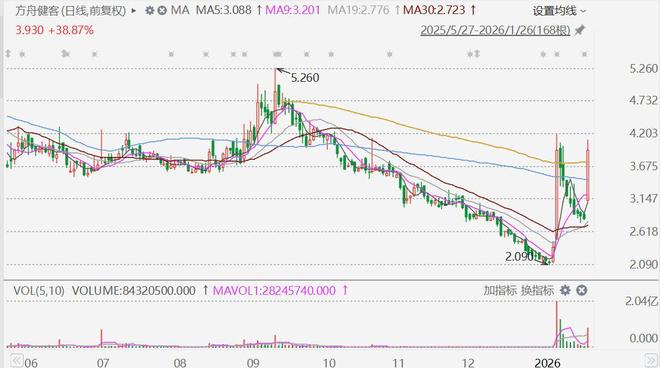 股价表现 - 方舟健客(06086.HK)股价大幅上涨,涨幅超过35%,截至发稿时具体涨幅为35.84% [1] - 公司股价报收于3.83港元 [1] - 成交额达到1.34亿港元 [1]