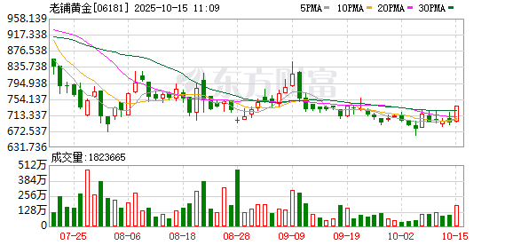 消息面上,摩根大通发布研报称,近日进行了数次考察,与老铺黄金管理层、店铺经理及专家交流,发 现其品牌价值提升趋势明确,因为即使在产品提价或品牌促销期结束后,消费者仍愿意在门店外排队等 候入内购物。根据8月至9月份数据,该行预测老铺黄金零售销售表现将维持强劲,憧憬公司将配合节庆 时间表推出更多新产品,并采用金漆技术等新工艺,以及未来持续调整门店网络,相信老铺黄金品牌价 值仍然继续提升。摩通轻微调整该公司2025至2027年盈利预测,目标价由原先1294港元微升至1296港 元,相当于预测2027年市盈率24倍,重申"增持"评级,列老铺黄金为中国消费行业的首选股之一。 据央视网报道,靠"古法工艺""中式审美"出圈的老铺黄金,即便今年2月、8月两次涨价,消费者依 然"买账"。北京SKP商场老铺黄金专柜销售人员小周介绍,单品价格多在1至6万元之间,根据工艺和结 合材料的不同,换算成克价约在1200到1700元,小克重产品单克的价格甚至超过2000元。 老铺黄金(06181)涨超6%,截至发稿,涨6.06%,报735港元,成交额11.3亿港元。 ...