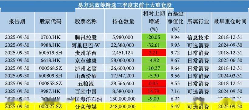 基金经理张坤三季度业绩与规模 - 截至2025年9月末,张坤在管4只基金总规模约565.44亿元,全部跑赢同期业绩基准 [1] - 规模最大的易方达蓝筹精选基金资产净值在三季度末为364.13亿元,较二季度末增加14.70亿元 [3] - 易方达优质精选基金三季度末规模为133.45亿元,易方达亚洲精选基金三季度末资产净值为34.78亿元 [7][12] 基金业绩表现 - 易方达蓝筹精选2025年三季度基金份额净值增长率为16.37%,同期业绩比较基准收益率为13.25% [3] - 易方达优质精选2025年三季度基金份额净值增长率为17.58%,同期业绩比较基准收益率为13.57% [8] - 易方达优质企业三年持有报告期内基金份额净值增长率为15.81%,同期业绩比较基准收益率为13.25% [10] - 易方达亚洲精选2025年三季度基金份额净值增长率为17.63%,同期业绩比较基准收益率为9.58% [12] 基金申购赎回情况 - 易方达蓝筹精选在2025年第三季度遭遇20.78亿份净赎回,创该基金成立以来第二高净赎回纪录 [3] - 易方达优质企业三年持有在三季度期间遭遇成立以来最高净赎回,达11.65亿份 [10] 投资组合配置与调整 - 张坤在三季度更加聚焦于内需消费与科技板块,增持了谷歌公司等标的 [1] - 易方达蓝筹精选三季度末股票仓位由92.63%微降至92.18%,前十大重仓股持股集中度由83.84%升至86.85% [3] - 易方达亚洲精选基金中,中国香港、中国台湾、美国的持股比例较以往上升,韩国股票持仓比例由16.03%下降至10.19% [2][12] 易方达蓝筹精选重仓股变动 - 前十大重仓股依次为腾讯控股、阿里巴巴-W、贵州茅台、京东健康、泸州老窖、山西汾酒、五粮液、百胜中国、中国海洋石油、分众传媒 [4] - 增持3只消费股:贵州茅台持仓数量增加3.01%、五粮液增加0.05%、百胜中国 [4][6] - 减持6只个股:腾讯控股持仓数量减少20.05%、阿里巴巴-W减少32.61%、京东健康减少4.92%、泸州老窖减少10.37%、山西汾酒减少5.30%、中国海洋石油减少9.09% [4][5][6] - 分众传媒首次进入前十大重仓股,持仓数量为248,000,000股,占基金净值比例5.49% [4][6] 易方达优质精选重仓股变动 - 前十大重仓股出现2只个股更迭,京东健康与分众传媒新进持仓前十 [7] - 增持贵州茅台持仓数量由867,800股增至880,000股,增持五粮液持仓数量由10,398,533股增至10,447,000股 [7][9] - 减持泸州老窖持仓数量减少10.43%,减持山西汾酒持仓数量减少6.00%,减持携程集团-S持仓数量减少3.06% [7][9] - 分众传媒获增持2000万股,增持比例达33.33%,三季度末持仓数量为80,000,000股 [7][9] - 顺丰控股等标的退出持仓前十 [7] 易方达优质企业三年持有重仓股变动 - 前十大重仓股未更迭,仅对部分个股进行增减持 [10] - 减持贵州茅台持仓数量减少15.13%,减持山西汾酒减少20.72%,减持京东健康减少43.87%,减持泸州老窖减少25.87%,减持五粮液减少16.62%,减持中国海洋石油减少4.76% [10][11] - 腾讯控股与阿里巴巴-W仍为前两大重仓股,但持仓数量分别减少35.24%和45.58% [11] 易方达亚洲精选重仓股变动 - 谷歌公司首次进入前十大重仓股,持股数量为15.30万股,占基金净值比例7.60% [12][13] - 二季度头号重仓股SK海力士退出持仓前十,普拉达重回持仓前十但持仓数量减少10万股 [12] - 减持腾讯控股持仓数量减少18.57%,减持阿里巴巴-W减少33.43%,减持台积电减少19.64%,减持携程集团-S减少19.64% [12][13] 投资理念与行业观点 - 投资策略为通过自下而上深度研究,寻找商业模式优秀、有显著竞争力和议价能力、行业有持续成长空间的少数公司长期持有 [14] - 长期最可能的情形是"中国消费增速>中国GDP增速>全球GDP增速" [2][15] - 中国居民消费占GDP的比例在全球主要国家中接近最低水平,该比例提升的概率远高于继续下降 [15] - 14亿人的统一巨大市场带来的产品、研发和销售规模效应无法忽视 [15] - 中国的内需消费市场长期仍是投资的沃土,当前较低估值水平提供充足安全边际 [16]