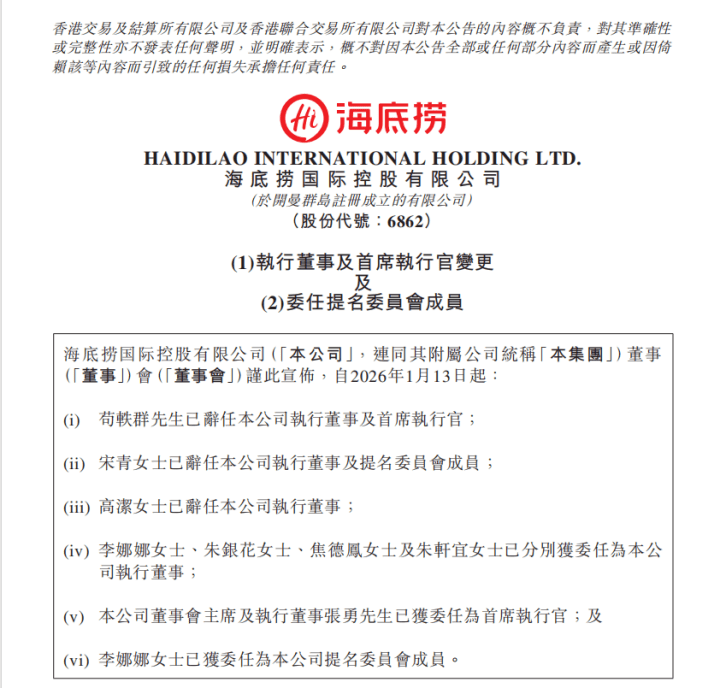 每经记者|可杨 每经编辑|金冥羽 魏文艺 海底捞(HK06862,股价15.80港元,市值880.69亿港元)再度迎来关键管理层调整。 1月13日晚间,海底捞公告称,因配合公司战略发展及董事会角色安排调整,苟轶群辞任执行董事及首席执行官职务,董事会主席及执行董事张勇获委任 为首席执行官(CEO)。 这意味着,张勇将兼任董事会主席和CEO,形成创始人重新回到一线经营核心的治理结构。 《每日经济新闻》记者(以下简称"每经记者")注意到,这是海底捞近四年来第三次更换CEO。自2022年张勇首次交棒以来,海底捞先后经历"啄木鸟计 划""硬骨头计划"以及多轮组织与门店体系调整。2024年,苟轶群接任CEO,海底捞进一步将数字化运营、多品牌探索和创新业务推向台前。 值得注意的是,这一系列调整发生在海底捞传统火锅主业承压、多项创新业务进入密集推进阶段的背景之下。2025年上半年,海底捞的营收、净利润及翻 台率均出现同比下滑,而外卖、多品牌及加盟业务则快速扩张,尤其在创新业务层面的探索明显加速。 截至今日港股收盘,海底捞股价涨9.15%。 公告显示,因服务于公司战略发展的董事会组成及角色调整,自1月13日起,苟轶群辞任公司执 ...