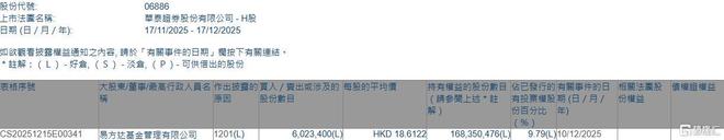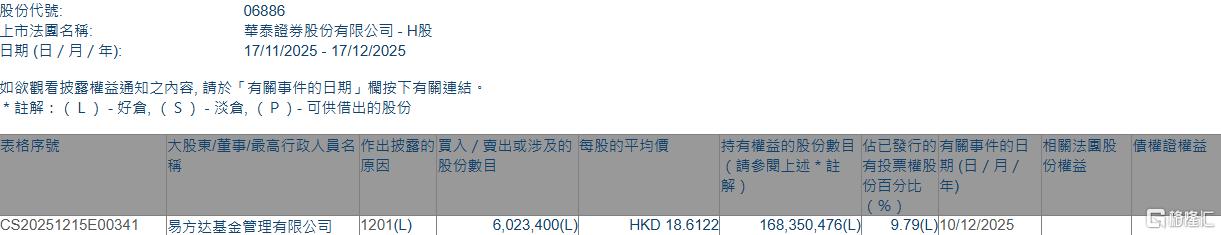 | 表格序號 | 大股東/董事/最高行政人員名 作出披露的 買入 / 賣出或涉及的 每股的平均價 | | | | 持有權益的股份數目 佔已發行的有關事件的日 相關法蘭 | | | --- | --- | --- | --- | --- | --- | --- | | | | 原因 | 股份數目 | | ( 請參閱上述 * 註 有投票權股期 (日 / 月 / | | | | | | | | 份百分比 年) | | | | | | | | 196 | | | CS20251215E00341 | 6,023,400(L) 易方达基金管理有限公司 | 1201(L) | | HKD 18.6122 | 168,350,476(L) | 9.79(L)10/12/2025 | 追加内容 格隆汇12月17日丨根据联交所最新权益披露资料显示,2025年12月10日,华泰证券(06886.HK)遭易方达基金管理有限公司在场内以每股均价18.6122港元减 持602.34万股,涉资约1.12亿港元。 减持后,易方达基金管理有限公司最新持股数目为168,350,476股,持股比例由10.14%下降至9.79%。 | 股份代號: ...
