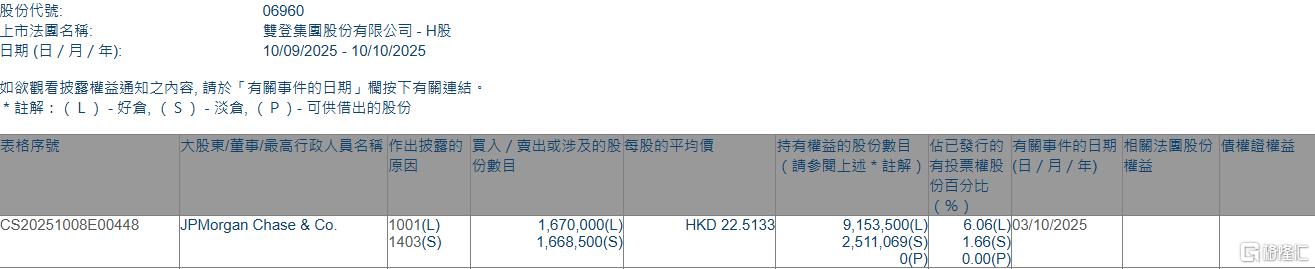 格隆汇10月10日丨根据联交所最新权益披露资料显示,2025年10月3日,双登股份(06960.HK)获JPMorgan Chase & Co.以每股均价22.5133港元增持好仓167万 股,涉资约3759.72万港元。 | 帳格序號 | 大股東/董事/最高行政人員名稱 作出披露的 買入 / 賣出或涉及的股每股的平均價 | | | | | 持有權益的股份數目 佔已發行的 有關事件的B | | | --- | --- | --- | --- | --- | --- | --- | --- | | | | | 行要 三 | | | (詩參閱上述*註解)有投票權股 (日/月/年 | | | | | | | | | 仿自分享 | | | CS20251008E00448 | JPMorgan Chase & Co. | 1001(L) | | 1.670.000(L | HKD 22.5133 | 9.153.500(L) 6.06(L)03/10/2025 | | | | | 1403(S) | | 1,668,500(S) | | 2.511.069(S) | 1.66(S) | | | | | | | | O ...