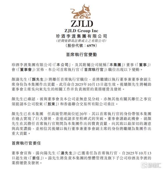 来源:智通财经 公告中披露简历显示,汤向阳,现年57岁,于1989年加入集团。汤向阳自2014年起担任江西李渡酒业有 限公司总经理,并自2023年4月起出任集团副总裁。此前,汤向阳曾担任华泽集团有限公司市场总监及 华南大区总监,并于湖南湘窖酒业有限公司生产及销售部门担任管理职务。(智通财经记者 郭莎莎) 10月13日,珍酒李渡集团有限公司(珍酒李渡,06979.HK)在港交所公告,公司董事会宣布,颜涛将 离任首席执行官职位,并将继续以执行董事兼董事会副主席身份为集团作出贡献,此任命自2025年10月 13日起生效。后续颜涛将辅助董事会主席吴向东的相关工作并负责湘窖的业务运营及发展。 同时,董事会宣布,汤向阳已获委任为首席执行官,自2025年10月13日起生效。汤向阳将负责集团的整 体管理及旗下子公司珍酒及李渡的业务运营及发展。 "港股白酒第一股"珍酒李渡CEO变动。 ...