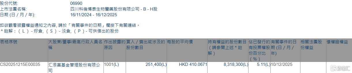 增持后,汇添富基金管理股份有限公司最新持股数目为831.83万股,持股比例由4.96%上升至5.11%。 | 家社部 | 大股東/董事/最高行政人員名 作出披露的 買入 / 南出或涉及的 每股的平均價 | | | 持有權益的股份數目 佔已發行的有關事件的日 相關法要 | | --- | --- | --- | --- | --- | | | 版 元夏 三 | | | (請參聞上述*註 有投票權股期(日 / 月 / 份權益 | | | | | | 份自分比 年) | | CS20251215E00035 | 汇添富基金管理股份有限公 1001(L) | 251.400(L) | HKD 410.0671 | 8.318.300(L) 5.11(L)10/12/2025 | 格隆汇12月16日丨根据联交所最新权益披露资料显示,2025年12月10日,科伦博泰生物-B(06990.HK)获汇添富基金管理股份有限公司在场内以每股均价 410.0671港元增持25.14万股,涉资约1.03亿港元。 ...