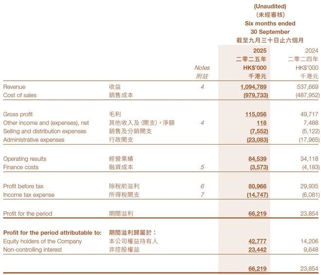 公司财务表现 - 截至2025年9月30日止6个月收益约为10.95亿港元,同比大幅增加约103.62% [1] - 公司权益持有人期间应占溢利约为4277.7万港元,同比显著增加约201.12% [1] - 每股基本盈利为0.58港仙 [1] 业绩驱动因素 - 收益增长主要受金价上涨驱动 [1] - 2023年收购的黄金及其他矿物精炼生产线产能提升至更接近设计产能,亦带动了收益增长 [1]