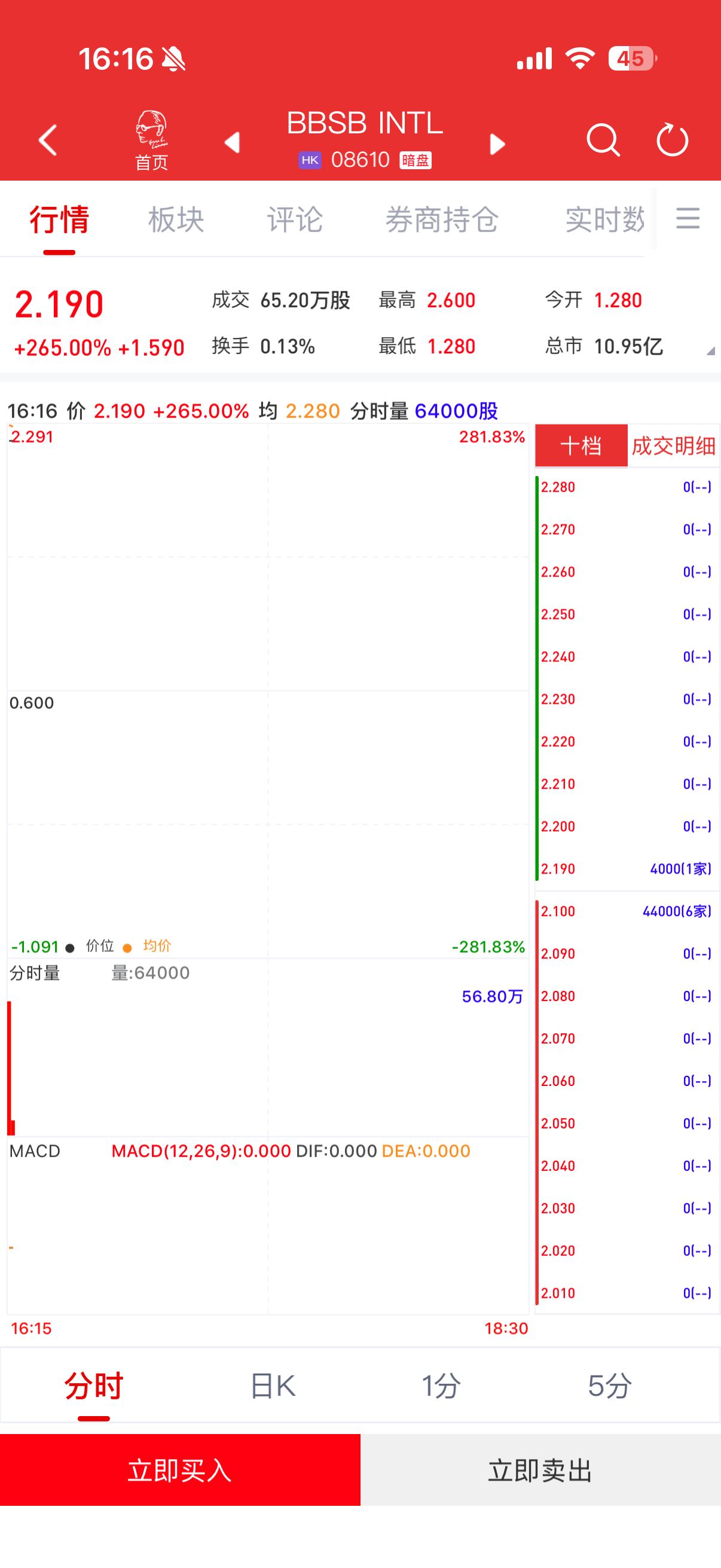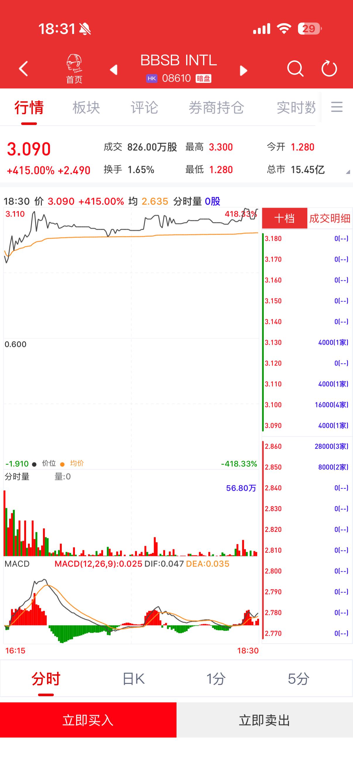 -1.910 ● 价位 ● 均价 -418.33% 2.850 m 分时量 量:0 56.80万 2.840 2.830 2.820 2.810 MACD MACD(12,26,9):0.025 DIF:0.047 DEA:0.035 2.800 2.790 2.780 2.770 16:15 18:30 分时 1分 5分 日K 立即买入 立即卖出 • 行情来源: 利弗莫尔证券 • 智通财经APP获悉,BBSB INTL(08610)将于2026年1月13日(星期二)在香港挂牌。截至收盘,利弗莫尔证券暗盘交易显示报价3.09港元,较招股价0.6港元上 涨415%,每手4000股,不计手续费,每手赚9960港元。 ...