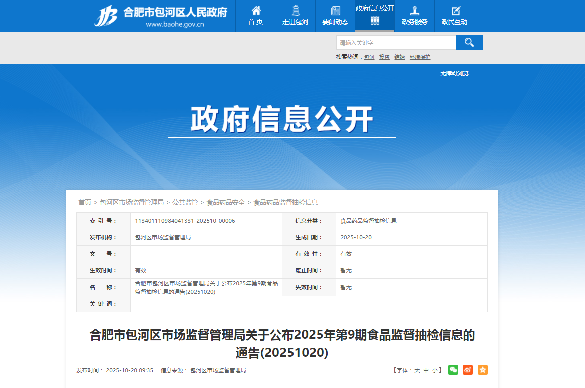 | 合 要闻动态 | 首页 www.baohe.gov.cn | 19 를 走进包河 | 政府信息公开 E | ਮ 政务服务 | 14 政民互动 | | --- | --- | --- | --- | --- | --- | | | | | 请输入关键字 | | O | | | | | 搜索热词:包河 投资 结婚 环境保护 | | | | | | | | 无障碍浏览 | | | 政府信息公开 | | | | | | | 首页 > 包河区市场监督管理局 > 公共监管 > 食品药品安全 > 食品药品监督抽检信息 | | | | | | | 索 引 号 : | 113401110984041331-202510-00006 | 信息分类: | 食品药品监督抽检信息 | | | | 发布机构 : | 包河区市场监督管理局 | 生成日期: | 2025-10-20 | | | | 文 号: | | 有效性: | 有效 | | | | 生效时间: | 有效 | 废止时间: | 暂无 | | | | 名 称: | 合肥市包河区市场监督管理局关于公布2025年第9期食品 监督抽检信息的通告(20251020) | 失效时间: ...