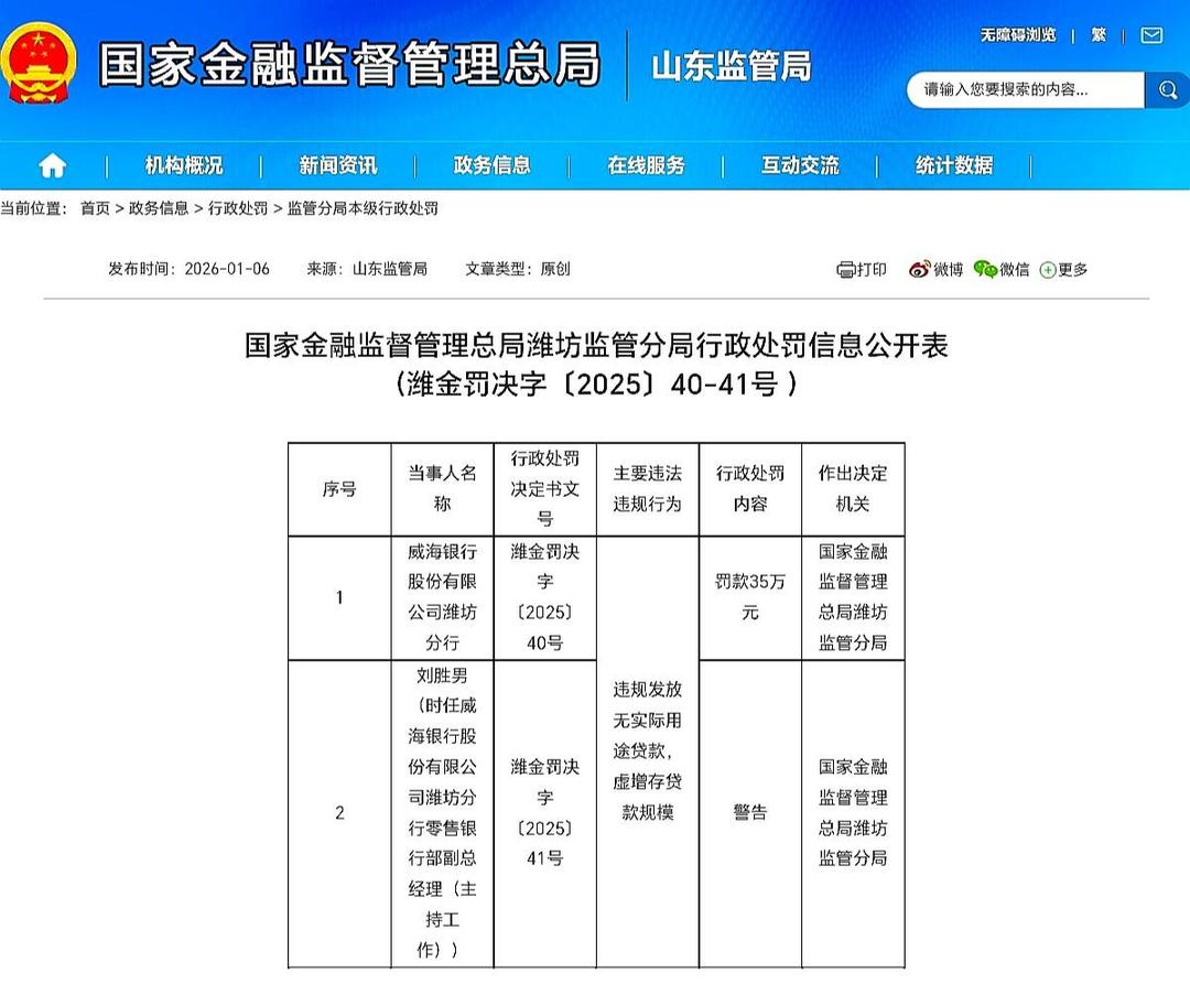 行政处罚事件概述 - 威海银行潍坊分行因违规发放无实际用途贷款、虚增存贷款规模被国家金融监督管理总局潍坊监管分局处以罚款35万元[1] - 时任该分行零售银行部副总经理(主持工作)刘胜男被给予警告处分[1] 具体违规行为分析 - 主要违法行为包括违规发放无实际用途贷款以及虚增存贷款规模[2] - 分析人士指出,此类“空壳贷款”资金未用于实际生产经营或消费,可能回流银行体系造成资金空转[2] 公司过往合规记录 - 威海银行潍坊分行在2024年1月曾因违反流通人民币管理规定受到中国人民银行潍坊市分行处罚[3]