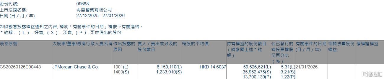 格隆汇1月27日丨根据联交所最新权益披露资料显示,2026年1月21日,再鼎医药(09688.HK)获JPMorgan Chase & Co.以每股均价14.6037港元增持好仓615.01 万股,涉资约8981.44万港元。 | 股份代號: | | --- | | 上市法國名稱: | | 日期(日/月/年 | | | (股東/董事/最高行政人員名稱作出披露的 冒入/曹出或涉及的 | | | 图段的平均值 | 符有權益的股份數目 | 佔已發行的 有關事件的日 | | --- | --- | --- | --- | --- | --- | --- | | | 校 7 31 三 | | | | 語参閱 「亦 * 註 | 有投票權版(日/月/年) 行营分证 | | CS20260126E00448 | JPMorgan Chase & Co. | 1001(L) | 6.150,110(L) | HKD 14.6037 | 59.526.621(L | 5.31(L)21/01/2026 | | | | 1403(S) | 1,233,010(S) | | 35.952,475(S) | 3.21(S) | | | ...
