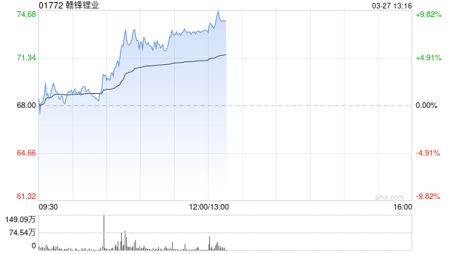 锂业股午后走强 赣锋锂业涨逾9%天齐锂业涨逾6%