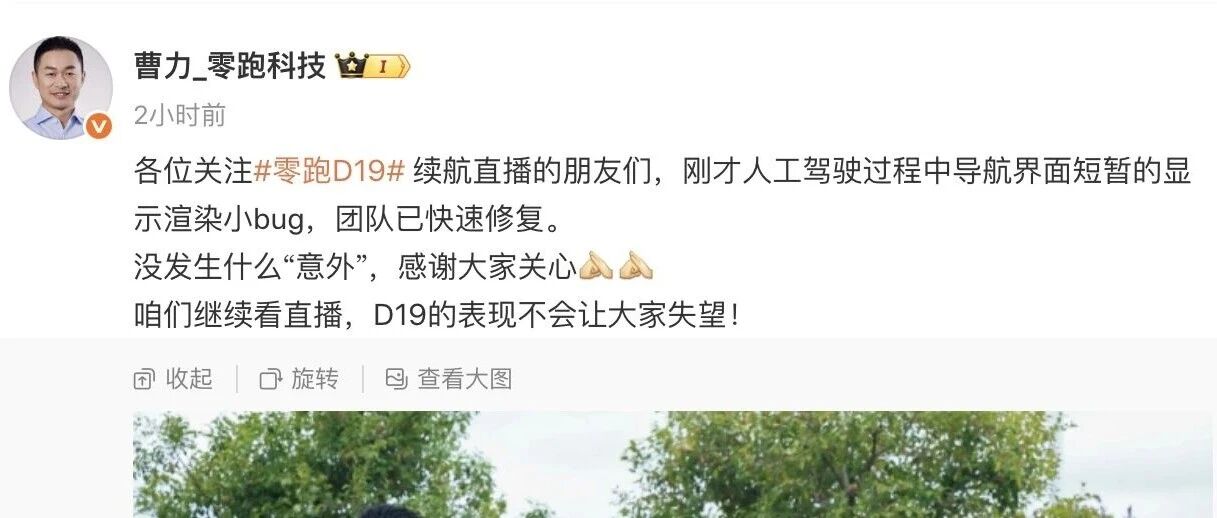 零跑科技高级副总裁回应“零跑汽车直播发生意外”:人工驾驶过程中导航界面短暂的显示渲染小bug,团队已快速修复