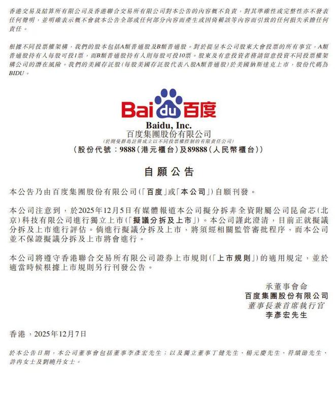 北京商报讯(记者 魏蔚)12月7日,百度发布公告称,本公司注意到,于2025年12月5日有媒体报道本 公司拟分拆非全资附属公司昆仑芯(北京)科技有限公司进行独立上市(「拟议分拆及上市」)。本公 司谨此澄清,目前正就拟议分拆及上市进行评估。倘进行拟议分拆及上市,将须经相关监管审批程序, 而本公司并不保证拟议分拆及上市将会进行。 ...