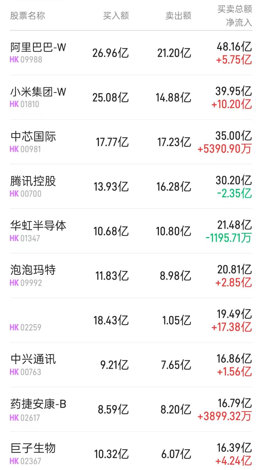 北水净买入最多的个股是紫金黄金国际(02259)、小米集团-W(01810)、阿里巴巴-W(09988)。北水净卖出最多的个股是中 芯国际(00981)、巨子生物(02367)、腾讯(00700)。 | 股票名称 | 买入额 | 卖出额 | 买卖总额 | | --- | --- | --- | --- | | | | | 净流入 | | 阿里巴巴-W | 26.96亿 | 21.20 亿 | 48.16亿 | | HK 09988 | | | +5.75 乙 | | 小米集团-W HK 01810 | 25.08亿 | 14.88 亿 | 39.95亿 | | | | | +10.20 乙 | | 中芯国际 | 17.77 乙 | 17.23亿 | 35.00亿 +5390.90万 | | HK 00981 | | | | | 腾讯控股 | 13.93亿 | 16.28 亿 | 30.20亿 | | HK 00700 | | | -2.35 / | | 华虹米导体 | 10.68亿 | 10.80亿 | 21.48亿 | | HK 01347 | | | -1195.71万 | | 泡泡玛特 HK 09992 ...
