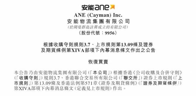 安能物流获财团私有化要约 今日下午1时起恢复股票交易