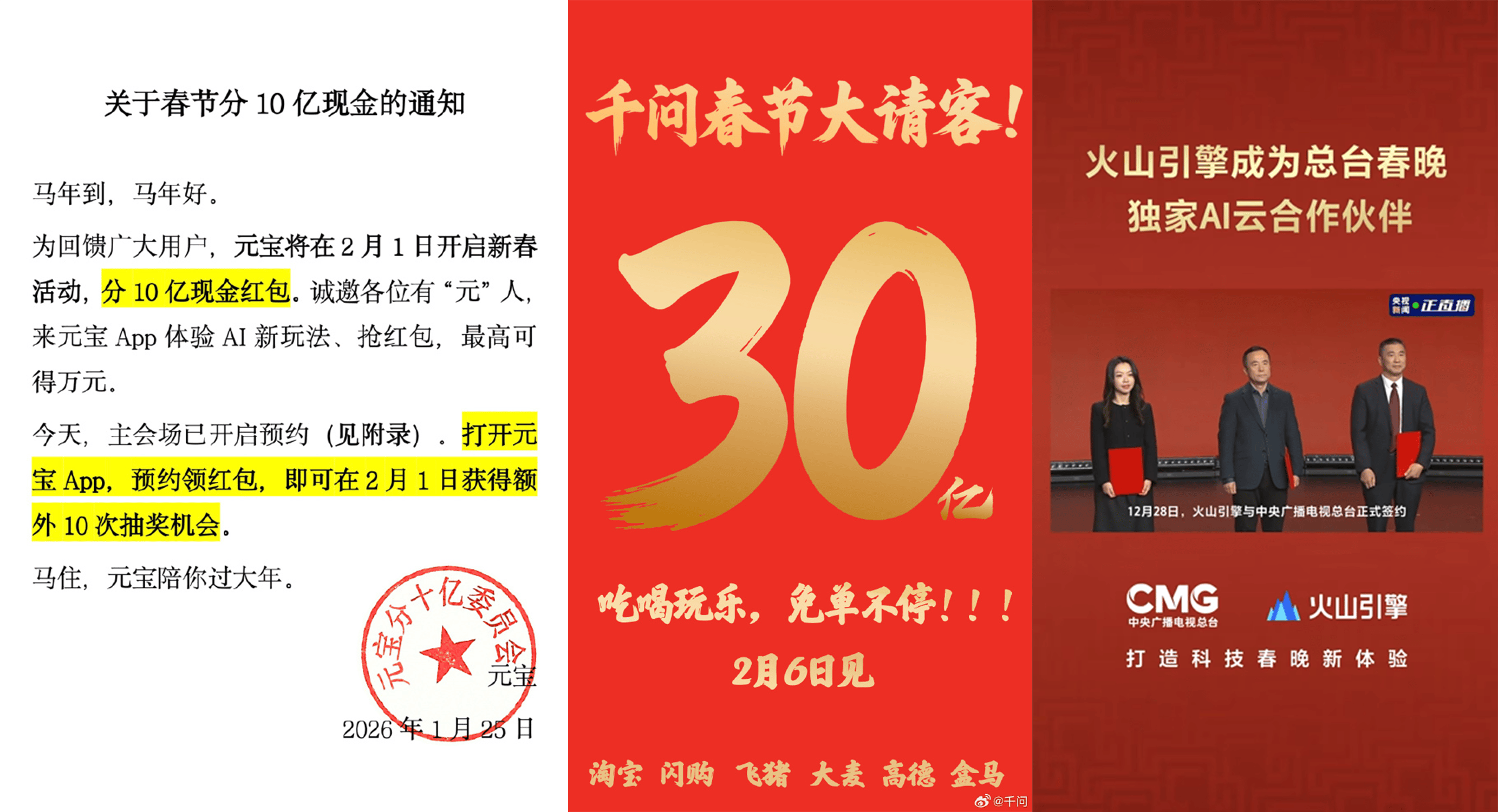 行业竞争态势 - 中国主要互联网科技公司正通过大规模春节红包营销活动,激烈争夺生成式AI应用市场份额 [1] - 苹果应用商店免费榜前三名均为AI应用,分别是阿里巴巴的“千问”、腾讯的“元宝”和字节跳动的“豆包”,显示AI应用已成为当前移动端用户获取的焦点 [1] 公司具体行动与市场表现 - 腾讯通过启动“分10亿现金”的年度红包活动,使其“元宝”APP下载量与用户活跃度激增,迅速攀升至苹果商店免费榜首位,一度超越长期占据榜首的字节跳动“豆包” [1] - 阿里巴巴旗下“千问”宣布投入30亿元启动“春节请客计划”,在APP内发布大额红包,并提供订餐饮、票务、旅行等服务的请客免单优惠 [1] - 百度宣布启动2026马年春节红包活动,总金额达5亿元,单个红包最高奖励1万元 [1] - 蚂蚁集团旗下AI健康助手“蚂蚁阿福”亦在相关渠道进行推广 [3] 战略目标与行业意义 - 腾讯公司高层表示,希望此次“元宝”的红包活动能够重现11年前微信红包通过春节活动取得巨大成功的时刻 [1] - 各大公司的巨额红包投入旨在通过补贴和优惠活动快速获取用户、提升应用活跃度,并在生成式AI应用的早期市场格局中建立领先地位 [1]