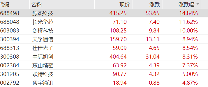 今日,亚太股市大反攻! 10月20日,A股三大指数强势反弹,截至午盘收盘,创业板指大涨2.5%。 热门科技股普涨,"易中天"光模块三巨头领涨,源杰科技大涨超15%,天孚通信(300394)、中际旭创(300308)、中石科技(300684)等 涨超10%,剑桥科技(603083)涨停;机器人概念活跃,华瑞股份(300626)、中威电子(300270)双双20cm涨停。下跌方面,贵金属板块 弱势震荡,湖南白银(002716)跌停;稀土永磁板块下挫,新莱福(301323)领跌;银行板块跌幅居前,渝农商行(601077)领跌。 | 代码 | 名称 | 现价 | 涨跌 | 涨跌幅 | | --- | --- | --- | --- | --- | | 688498 | 源杰科技 | 415.25 | 53.65 | 14.84% | | 688048 | 长米华芯 | 71.10 | 7.40 | 11.62% | | 603083 | 剑桥科技 | 108.25 | 9.84 | 10.00% | | 300394 | 天孚通信 | 159.70 | 13.11 | 8.94% | | 688313 | 仕佳光子 ...