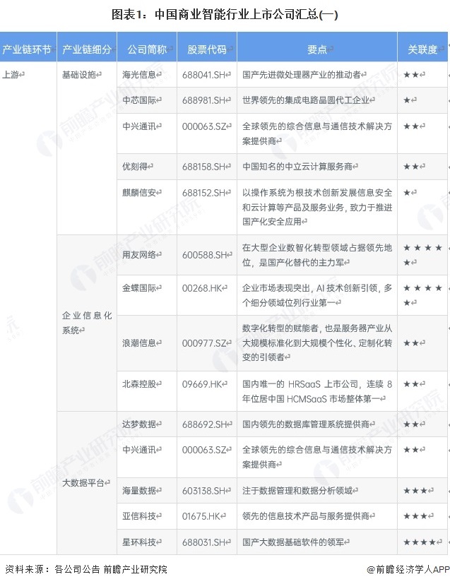 转自:前瞻产业研究院 行业主要上市公司:百度集团(09888.HK)、网易(09999.HK)、浪潮信息(000977.SZ)、美林数据 (831546.NQ)、数聚软件(838617.NQ)等 本文核心数据:相关业务销量;相关业务收入 1、商业智能行业上市公司汇总 目前,商业智能上市企业数量较少,代表性企业包括:百度集团、网易、浪潮信息,具体情况如下: 资料来源:各公司公告 前瞻产业研究院 @前瞻经济学人APP 产业链环节 | 产业链细分 公司简称 股票代码 - 要点 - 关联度 中游e 商业智能软 阿里巴巴e 09988.HK2 全球知名的互联网巨头( ★★★ 件和技术平 +1 台4 / 百度集团(2 09888.HK2 拥有强大互联网基础的领先 AI 公司e2 ★★★★ 网易(2 09999.HK2 中国领先的互联网技术公司e2 實實實實 数字化转型的赋能者,也是服务器产业从 大规模标准化到大规模个性化、定制化转 浪潮信息(2 000977.SZe ★★( 变的引领者e 腾讯控股(2 世界领先的互联网科技公司e2 00700.HK+ **** 15 国内知名的数据治理和数据分析服务提 美林数据e 831 ...
