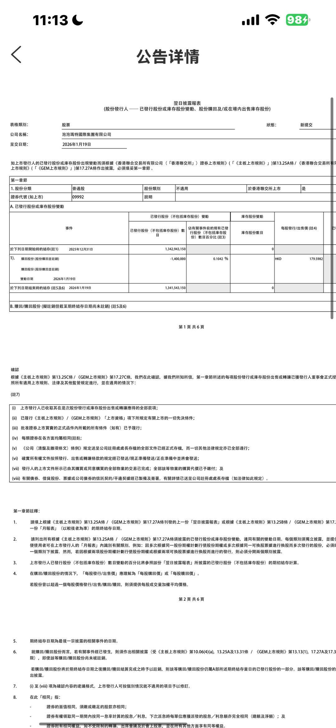 股份数据 - 2026年1月19日已发行股份(不含库存)1,341,543,150股,库存股0股,总数同[3] - 2026年1月21日公司购回500,000股,付出96,489,560港元[12] - 公司可根据购回授权购回总数为134,294,315股[12] 购回情况 - 购回授权决议2025年5月27日获通过[12] - 已购回股份占决议通过日已发行股份0.1415%[12] 时间限制 - 股份购回新股发行等暂停期截至2026年2月20日[12] - 购回股份后30天内不得发行新股等[13]