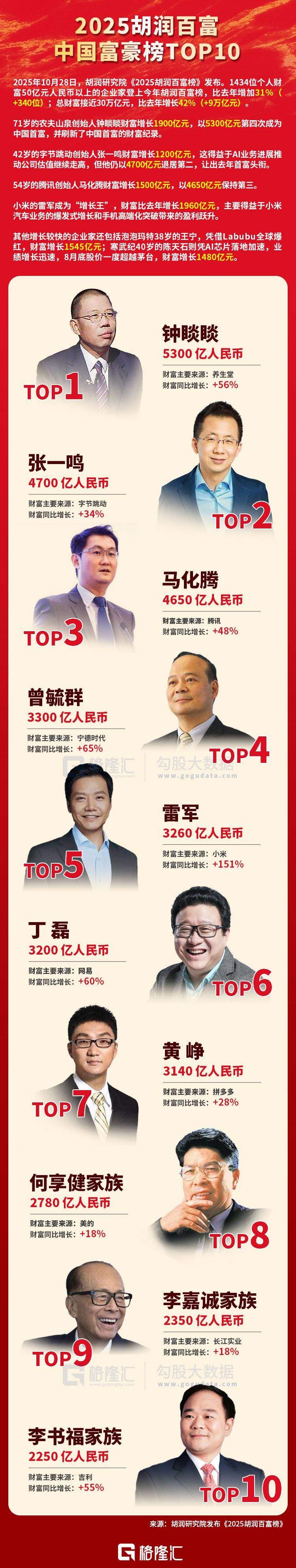 2025胡润百富中国富豪榜TOP10:钟睒财富5300亿第四次成中国首富,张一鸣4700亿退居第二,马化腾4650亿第三,雷军3260亿第五