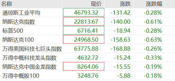 10月22日,美股开盘涨跌不一,截至北京时间22:30,三大指数均转跌。道指跌0.28%,标普500指数跌0.28%,纳指跌 0.61%。 | 名称 | 现价 | 涨跌 | 涨跌幅 | | --- | --- | --- | --- | | 道琼斯工业平均 | 46793.32 | -131.42 | -0.28% | | 纳斯达克指数 | 22813.67 | -140.00 | -0.61% | | 标普500 | 6716.41 | -18.94 | -0.28% | | 纳斯达克100 | 24968.50 | -158.63 | -0.63% | | 万得美国科技七巨头指数 | 63775.88 | -168.88 | -0.26% | | 万得中概科技龙头指数 | 4632.72 | -15.24 | -0.33% | | 纳斯达克中国金龙指数 | 8264.06 | -15.55 | -0.19% | | 万得中概股100 | 3248.76 | -5.88 | -0.18% | 科技七巨头跌多涨少,谷歌涨0.75%、微软涨近1%,特斯拉跌1.82%,亚马逊跌超2%。消息面上,10月20日亚马逊 ...