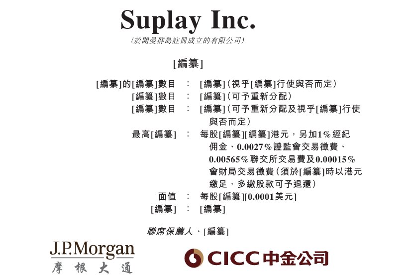 香港聯合交易所有限公司與證券及期貨事務監察委員會對本申請版本的內容概不負責,對其準確性或完整 性亦不發表任何意見,並明確表示概不就因本申請版本全部或任何部分內容而產生或因倚賴該等內容而引 致的任何損失承擔任何責任。 Suplay Inc. (「本公司」) (於開曼群島註冊成立的有限公司) 的申請版本 警告 本申請版本乃根據香港聯合交易所有限公司(「聯交所」)與證券及期貨事務監察委員會(「證監 會」)的要求而刊發,僅用作提供資訊予香港公眾人士。 本申請版本為草擬本,其所載資料並不完整,亦可能會作出重大變動。閣下閱覽本文件,即代 表閣下知悉、接納並向本公司、其保薦人、整體協調人、顧問或包銷團成員表示同意: 本公司招股章程根據香港法例第32章《公司(清盤及雜項條文)條例》呈交香港公司註冊處處長 登記前,本公司不會向香港公眾人士提出要約或邀請。倘於適當時候向香港公眾人士提出要約 或邀請,準投資者務請僅依據呈交香港公司註冊處處長登記的本公司招股章程作出投資決定; 有關文本將於發售期內向公眾刊發。 (a) 本文件僅為向香港公眾人士提供有關本公司的資料,概無任何其他目的;投資者不應根 據本文件中的資料作出任何投資決定; ( ...