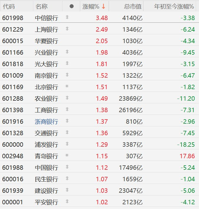 | 代码 | 名称 | | 涨幅% ↓ | 总市值 | 年初至今涨幅% | | --- | --- | --- | --- | --- | --- | | 601998 | 中信銀行 | 1 | 3.48 | 4140亿 | -3.38 | | 601229 | 上海银行 | 1 | 2.49 | 1346 Z | -6.24 | | 600015 | 华夏銀行 | | 2.05 | 1030亿 | -4.34 | | 601166 | 兴业银行 | 1 | 1.98 | 4036亿 | -9.45 | | 601818 | 光大银行 | 1 | 1.81 | 1997亿 | -3.15 | | 601009 | 南京银行 | 1 | 1.52 | 1322亿 | -6.47 | | 601169 | 北京银行 | 来 | 1.51 | 1137亿 | -1.82 | | 601288 | 农业银行 | 1 | 1.49 | 23869亿 | -11.20 | | 601398 | 工商银行 | 1 | 1.38 | 26196亿 | -7.31 | | 601916 | 浙商银行 | 1 | 1.37 | ...