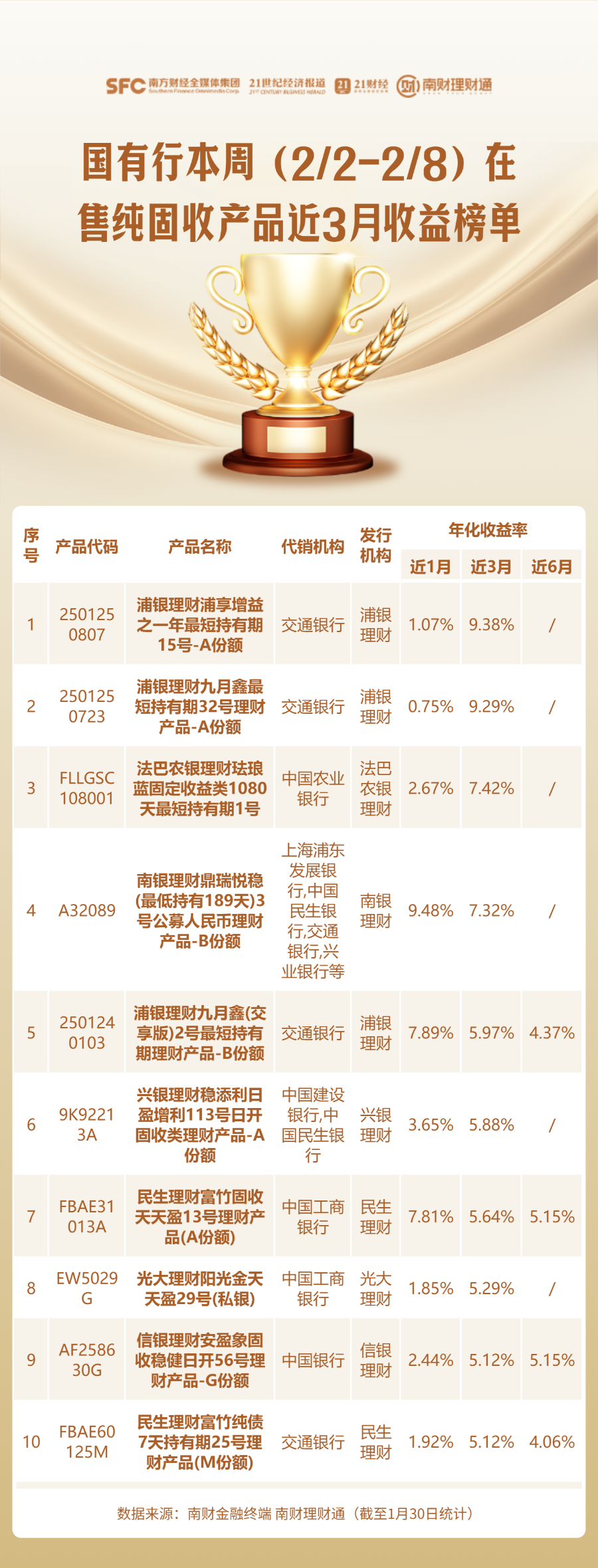 需要特别提醒的是:本榜单对理财产品"在售"状态的判断基于其投资周期推算。但实际情况中,部分产品可能因额度售罄,或 银行针对不同客户展示的产品清单存在差异而无法购买。因此,建议投资者以代销银行APP的实际展示为准。 为提供有效的选品参考,榜单展示了产品近一月、近三月及近六月的年化业绩,并按照近三月年化收益率进行排序,以此反映 其在近期市场波动中的多维度收益表现。 统计代销机构(28家):工商银行、中国银行、农业银行、邮储银行(601658)、建设银行、交通银行、招商银行、中信银 行、光大银行、民生银行、兴业银行、浦发银行、广发银行、浙商银行(601916)、华夏银行、平安银行、恒丰银行、渤海银 行、北京银行、宁波银行、江苏银行(600919)、上海银行(601229)、南京银行、杭州银行(600926)、徽商银行、微众银 行、网商银行、百信银行。 本期,课题组重点关注理财公司发行的纯固收产品,从代销渠道为投资者筛选出表现较优的在售产品。 城商行本周 (2/2-2/8) 在 售纯固收产品近3月收益榜单 此外,南财理财通虽力求客观公正,但不对本评价榜信息的真实性、完整性和准确性作任何保证,排名信息仅供参考。 | 2 ...