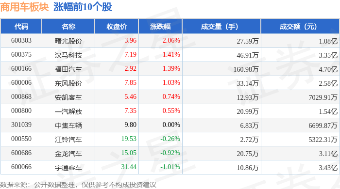 证券之星消息,11月11日商用车板块较上一交易日下跌1.11%,江淮汽车领跌。当日上证指数报收于 4002.76,下跌0.39%。深证成指报收于13289.0,下跌1.03%。商用车板块个股涨跌见下表: 从资金流向上来看,当日商用车板块主力资金净流出3.6亿元,游资资金净流入9909.89万元,散户资金净 流入2.61亿元。商用车板块个股资金流向见下表: | 代码 | 名称 | 主力净流入(元) | 主力净占比 游资净流入 (元) | | 游资净占比 散户净流入 (元) | | 散户净占比 | | --- | --- | --- | --- | --- | --- | --- | --- | | 600166 福田汽车 | | 3993.67万 | 8.49% | 395.76万 | 0.84% | -4389.43万 | -9.34% | | 600375 汉马科技 | | 1305.24万 | 3.89% | -1927.45万 | -5.75% | 622.21万 | 1.86% | | 600006 东风股份 | | 945.34万 | 3.66% | 338.62万 | 1.31% | -1283. ...