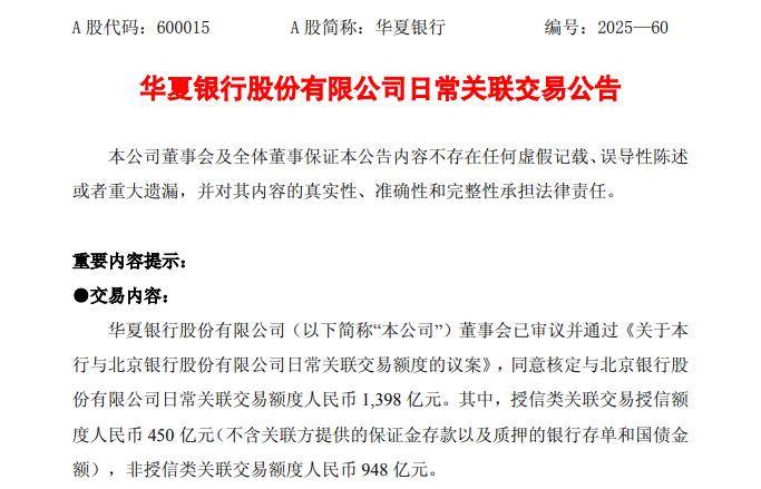 1398亿元!华夏银行核定与北京银行日常关联交易额度