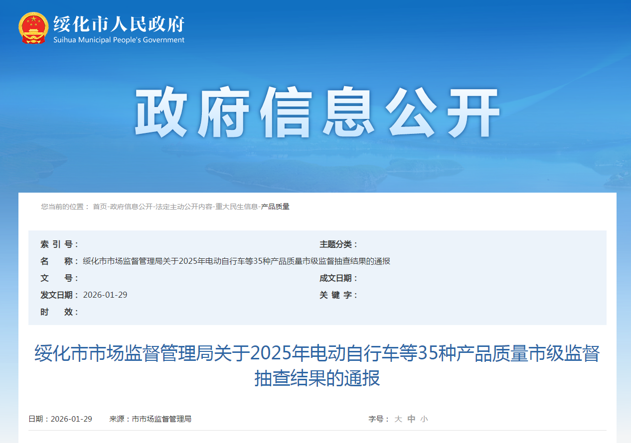 黑龙江省绥化市市场监督管理局通报2025年电动自行车等35种产品质量市级监督抽查结果