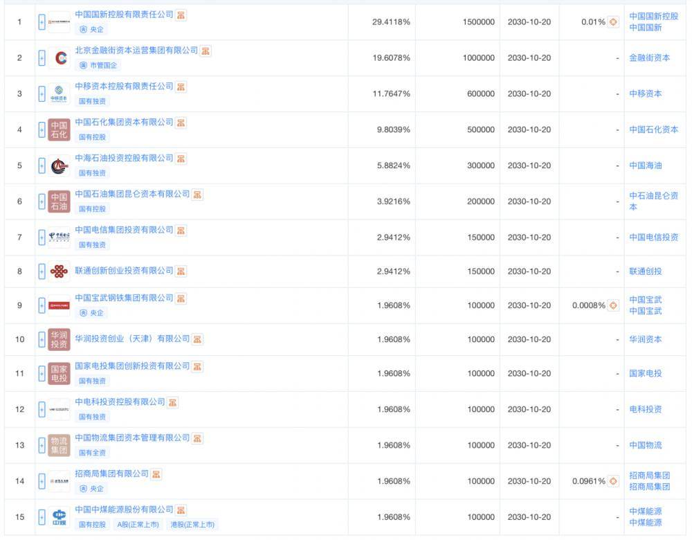 【DT新材料】 获悉,近日,由国务院国资委发起,委托中国国新设立和管理的 中央企业战略性新兴产业发展专项基金 在北京启动。 | 1 | | 中国国新控股有限责任公司 富 | 29.4118% | 1500000 | 2030-10-20 | 0.01% + | 中国国新控股 | | --- | --- | --- | --- | --- | --- | --- | --- | | | | 圆 央企 | | | | | 中国国新 | | 2 | | 北京金融街资本运营集团有限公司 届 国 市管国企 | 19.6078% | 1000000 | 2030-10-20 | | 金融街资本 | | చి | ( 中国车 | 中移资本控股有限责任公司 届 国有独资 | 11.7647% | 600000 | 2030-10-20 | | 中移资本 | | 4 | 石化 | 中国石化集团资本有限公司 品 国有控股 | 9.8039% | 500000 | 2030-10-20 | | 中国石化资本 | | | | 中海石油投资控股有限公司 品 | | | | | | | 5 | C | 国有独资 | 5.8824% | ...