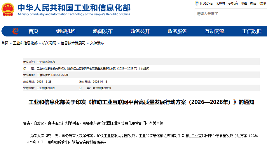 【环球网财经综合报道】中国工业互联网产业再次迎来重磅政策红利。1月13日,工业和信息化部正式印发《推动工业互联网平台 高质量发展行动方案(2026—2028年)》,为未来三年工业互联网的发展设定了明确的"路线图"和"时间表"。方案提出,到2028 年,要培育超过450家具有一定影响力的工业互联网平台,工业设备连接数突破1.2亿台(套),平台普及率达到55%以上。 工业互联网作为新一代信息技术与制造业深度融合的基石,正在重塑现代工业的发展逻辑。近年来,国家层面持续加大对这一领 域的支持力度。自2017年发展工业互联网上升为国家战略以来,政府工作报告已连续八年对该领域作出部署。特别是近期,工信 部密集出台了《工业互联网和人工智能融合赋能行动方案》及《打造"5G+工业互联网"512工程升级版实施方案》等文件,明确提 出推动5万家以上企业完成新型工业网络改造,并建设1万个5G工厂。这一系列政策组合拳,显示出国家推动制造业数字化、智能 化转型的坚定决心。 在政策的持续驱动下,我国工业互联网产业规模已连续保持高速增长态势。据工业和信息化部部长李乐成介绍,2025年我国工业 互联网核心产业规模预计已超过1.6万亿元,带动工 ...