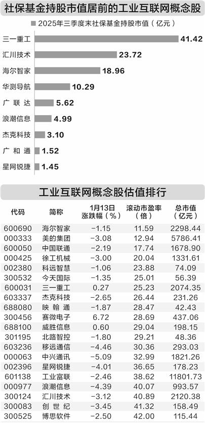 1月13日,工业和信息化部印发《推动工业互联网平台高质量发展行动方案(2026—2028年)》,方案 对2028年的目标提出具体规划,包括培育超450家具有一定影响力的平台,工业设备连接数突破1.2亿台 (套),平台普及率达到55%以上。 | 46.85 | 简称 | 1月13日 | 溪司市空室 | 总市值 | | --- | --- | --- | --- | --- | | | | 涨跌幅(%) | (倍) | (亿元) | | 600690 | 海尔智家 | -1.15 | 11.59 | 2298.44 | | 000333 | 美的集团 | -3.08 | 12.94 | 5786.41 | | 600050 | 中国联通 | -2.19 | 17.74 | 1678.90 | | 000425 | 徐工机械 | -3.00 | 20.04 | 1331.61 | | 002380 | 科远智慧 | -1.06 | 23.88 | 74.09 | | 300532 | 今天国际 | -1.35 | 25.01 | 56.39 | | 600031 | 三一重工 | 0.27 | 25.23 | 20 ...