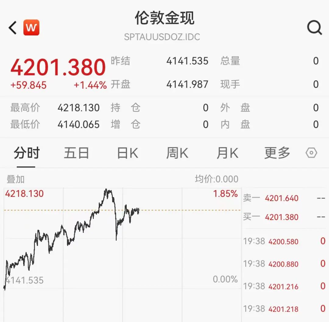 10月15日,黄金继续新高,一度攀升至4210美元/盎司的高点。 | W | 伦敦金现 | | | | | | | | --- | --- | --- | --- | --- | --- | --- | --- | | | SPTAUUSDOZ.IDC | | | | | | | | 4201 380 "F | 4141.535 | | | 息量 | | | 0 | | +59.845 | +1.44% 十益 | | 4141.987 | 现手 | | | 0 | | 最高价 | 4218.130 持 | | 0 | Ar | 在 | | 0 | | 最低价 | 4140.065 博 色 | | 0 | 内 | | | | | 分时 | モ日 | 日K | 周K | 目K | | 童苦 | | | 叠加 | | | | 均价:0.000 | | | | | 4218.130 | | | | 1.85% | | 4201.640 | | | | | | | | | 4201.380 | | | | | | | | | 19:38 4200.580 | 0 | | | | | | 0.00% | | 19:38 ...