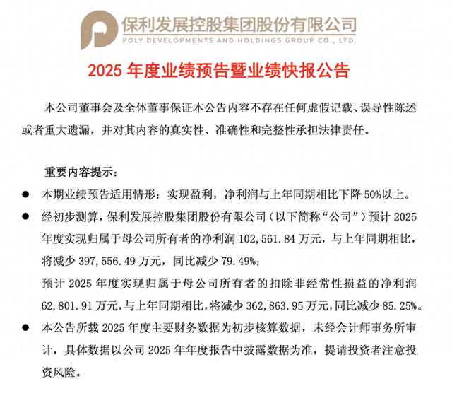 保利发展预计2025年归母净利润10.26亿元 同比减少79.49%
