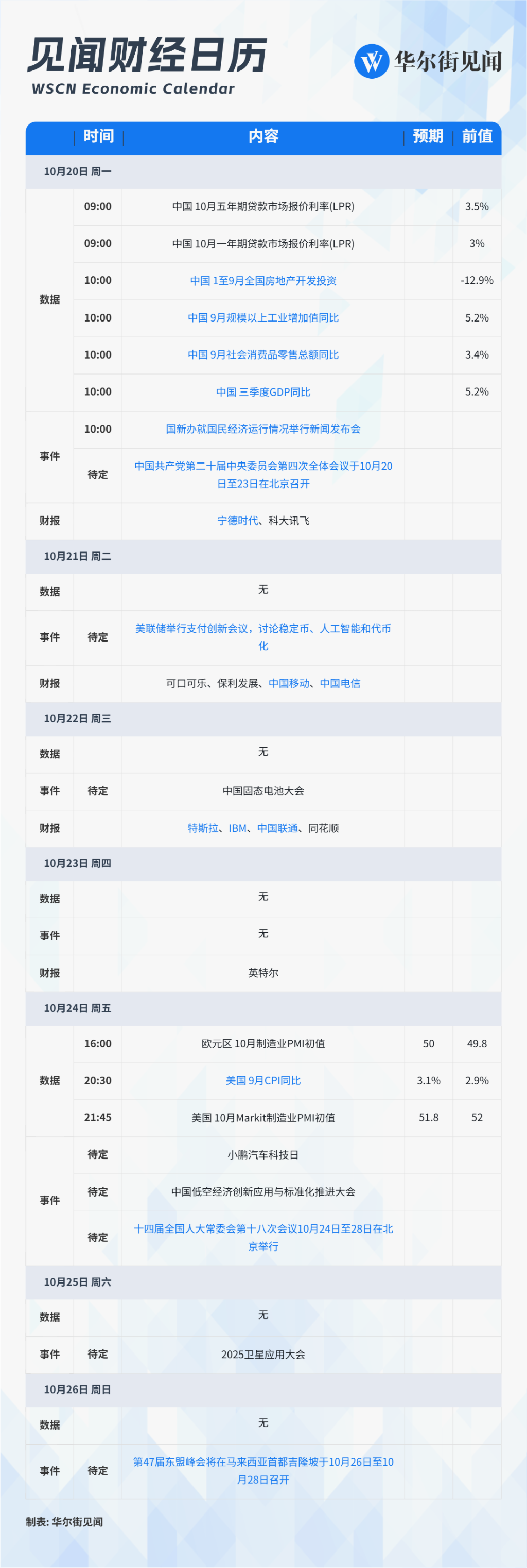 见闻财经日历 WSCN Economic Calendar w 华尔街见闻 | 时间 | | 内容 | 预期 前值 | | | --- | --- | --- | --- | --- | | 10月20日 周一 | | | | | | 数据 | 09:00 | 中国 10月五年期贷款市场报价利率(LPR) | | 3.5% | | 09:00 | | 中国 10月一年期贷款市场报价利率(LPR) | | 3% | | 10:00 | | 中国 1至9月全国房地产开发投资 | | -12.9% | | 10:00 | | 中国 9月规模以上工业增加值同比 | | 5.2% | | 10:00 | | 中国 9月社会消费品零售总额同比 | | 3.4% | | 10:00 | | 中国 三季度GDP同比 | | 5.2% | | 事件 | 10:00 待定 | 国新办就国民经济运行情况举行新闻发布会 中国共产党第二十届中央委员会第四次全体会议于10月20 | | | | | | 日至23日在北京召开 | | | | 财报 | | 宁德时代、科大讯飞 | | | | 10月21日 周二 | | | | | | 数据 ...