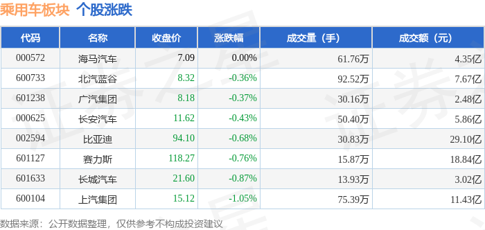 市场整体表现 - 2025年1月21日,乘用车板块整体下跌0.72%,表现弱于大盘,当日上证指数上涨0.08%,深证成指上涨0.7% [1] - 板块内多数个股收跌,领跌个股为上汽集团,跌幅为1.05% [1] 个股价格与交易情况 - 上汽集团收盘价15.12元,下跌1.05%,成交75.39万手,成交额11.43亿元 [1] - 比亚迪收盘价94.10元,下跌0.68%,成交30.83万手,成交额29.10亿元 [1] - 赛力斯收盘价118.27元,下跌0.76%,成交15.87万手,成交额18.84亿元 [1] - 长安汽车收盘价11.62元,下跌0.43%,成交50.40万手,成交额5.86亿元 [1] - 长城汽车收盘价21.60元,下跌0.87%,成交13.93万手,成交额3.02亿元 [1] - 广汽集团收盘价8.18元,下跌0.37%,成交30.16万手,成交额2.48亿元 [1] - 北汽蓝谷收盘价8.32元,下跌0.36%,成交92.52万手,成交额7.67亿元 [1] - 海马汽车收盘价7.09元,涨跌幅为0.00%,成交61.76万手,成交额4.35亿元 [1] 板块资金流向 - 当日乘用车板块整体呈现主力资金净流出,净流出金额为6.59亿元 [1] - 游资资金净流入1.41亿元,散户资金净流入5.18亿元 [1] 个股资金流向明细 - 比亚迪主力资金净流出4.37亿元,净占比为-15.03%,散户资金净流入4.26亿元,净占比为14.62% [2] - 赛力斯主力资金净流出1.81亿元,净占比为-9.61%,游资净流入7480.25万元,散户净流入1.06亿元 [2] - 长城汽车主力资金净流出2460.41万元,净占比为-8.16%,游资净流入1876.07万元 [2] - 北汽蓝谷主力资金净流出1433.75万元,净占比为-1.87%,游资净流入1515.09万元 [2] - 海马汽车主力资金净流出531.67万元,净占比为-1.22%,游资净流出2300.60万元,散户净流入2832.27万元 [2] - 上汽集团主力资金净流出76.84万元,净占比为-0.07%,游资净流入5956.48万元,净占比5.21%,散户净流出5879.64万元 [2] - 广汽集团主力资金净流入219.60万元,净占比0.89%,游资净流入1618.66万元,散户净流出1838.26万元 [2] - 长安汽车主力资金净流入218.77万元,净占比0.37%,游资净流出3199.77万元,散户净流入2981.00万元 [2]