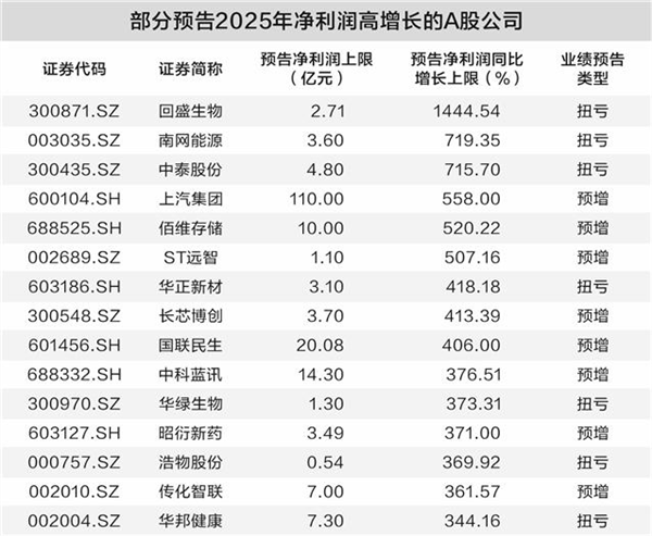 (原标题:百余家A股公司,去年净利或翻倍!) A股逐步迎来业绩预告高峰。截至1月20日晚间,已有超过500家A股公司披露2025年业绩预告或业绩快 报。 2025年,在AI技术的强势赋能下,科技领域多个细分赛道保持高景气态势,产业链上下游大量企业凭 借技术迭代与需求释放,实现了业绩的稳健增长。而光伏、白酒、生猪养殖等细分领域受市场环境波 动、供需格局调整等因素影响,企业业绩承压。 百余家公司预计净利翻倍 | | | 部分预告2025年净利润高增长的A股公司 | | | | --- | --- | --- | --- | --- | | 证券代码 | 证券简称 | 预告净利润上限 | 预告净利润同比 | 业绩预告 | | | | (亿元) | 增长上限(%) | និគ្គភិ | | 300871.SZ | 回盛生物 | 2.71 | 1444.54 | 拥亏 | | 003035.SZ | 南网能源 | 3.60 | 719.35 | 扭亏 | | 300435.SZ | 中泰股份 | 4.80 | 715.70 | 扭亏 | | 600104.SH | 上汽集团 | 110.00 | 558.00 | 预 ...
