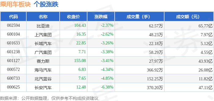 | 代码 | 名称 | 收盘价 | 涨跌幅 | 成交量(手) | 成交额(元) | | --- | --- | --- | --- | --- | --- | | 002594 | 比亚迪 | 104.43 | -2.37% | 62.57万 | 65.77 Z | | 600104 | 上汽集团 | 16.35 | -2.62% | 48.23万 | 7.974Z | | 601633 | 长城汽车 | 22.85 | -3.26% | 22.18万 | 5.12亿 | | 601238 | 广汽集团 | 7.71 | -3.38% | - 58.29万 | 4.55 Z | | 601127 | 赛力斯 | 155.08 | -3.41% | 27.97万 | 43.93 Z | | 000572 | 海马汽车 | 6.83 | -4.34% | 366.92万 | 26.08亿 | | 600733 | 北汽蓝谷 | 7.65 | -4.85% | 152.25万 | 11.82亿 | | 000625 | 长安汽车 | 12.48 | -6.38% | 370.20万 | 47.11亿 | 以上内容为 ...